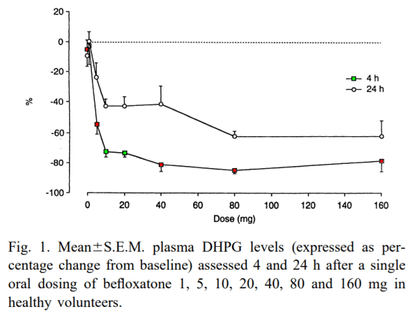 • This Befloxatone data shows a plateau starting at 10 – 20 mg for DHPG reduction, and higher doses of both Befloxatone and Moclobemide negligibly improve DHPG reduction, indicating MAO-A being sufficiently inhibited at these doses. This equates to about -80% DHPG reduction, since Befloxatone at 20 mg has -81% DHPG reduction and 300 mg Moclobemide has -80%